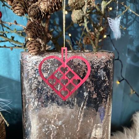 Alle ornamenter er laserskåret i eg eller valnød, valgt for at styrke de fine udskæringer. No-waste i praksis – overskudstræ bliver til smykker og små unika-serier.